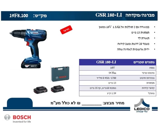 מידע נוסף/ הערות | מברגה/מקדחה עוצמתית, בעלת מומנט ממוטב להברגה וקדיחה במהירות, הודות לתיבת הילוכים פלנטרית בעלת 2 הילוכים, יכולת הברגה בשני הכיוונים, שינוי אביזרים בקלות ובמהירות, תאורת LED המסייעת לעבודה באזורים חשוכים. הכשיר מתאים לעבודה מקצועית עם מתכת ועץ. |